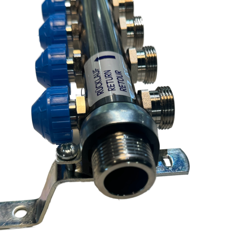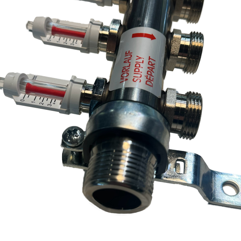 Die benötigten Absperreinrichtungen (Kugelhahn 1” Innengewinde) müssen separat bestellt werden. Die Verteilerrohre besitzen ein 1” Außengewinde für flachdichtende Montage.