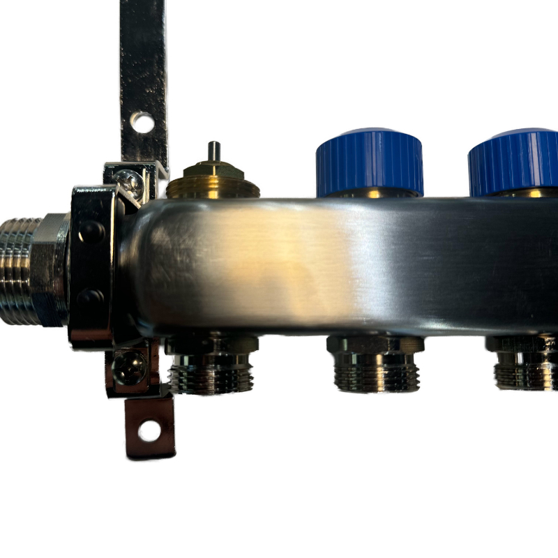 Der Systemverteiler überzeugt durch seine einfache, aber dennoch hochwertige Ausführung aus starkwandigem Edelstahl nach DIN EN 1264-4. Der Verteiler bietet ein Anschlussgewinde (1“ AG) für einfache Montagemöglichkeiten auf der linken Seite.