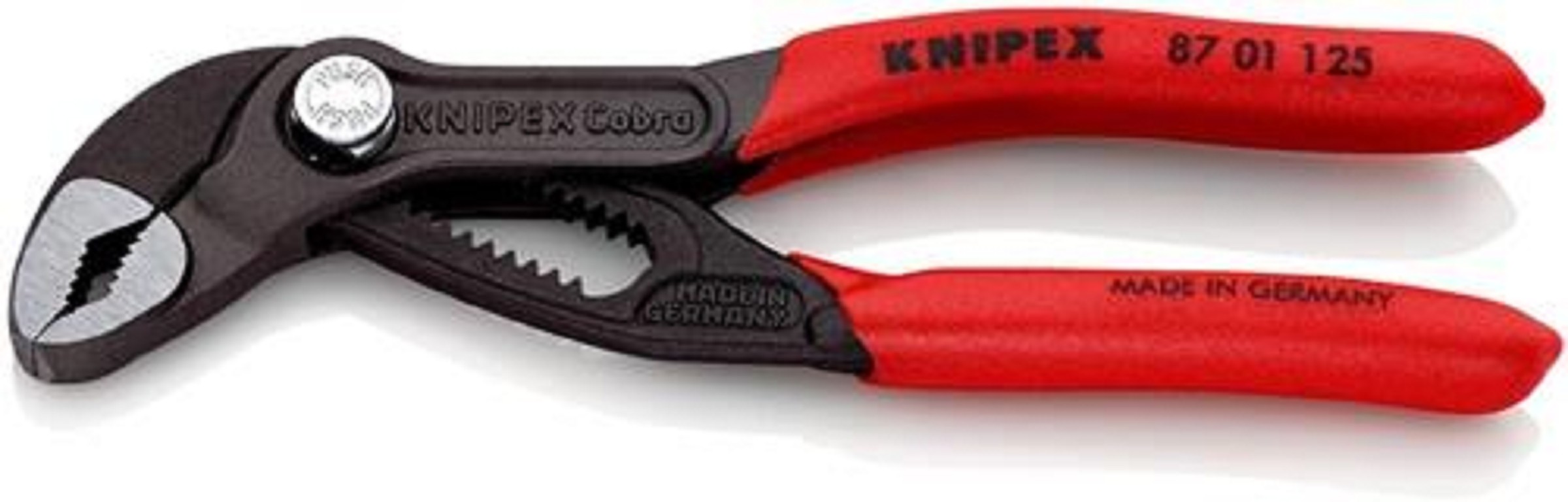 Die Wasserpumpenzange Cobra 1 ist selbstklemmend an Rohren und Muttern und ermöglicht eine stabile Handhabung. Dank des durchgesteckten Gelenks bietet die Zange hohe Stabilität durch doppelte Führung. Die Einstellung erfolgt einfach per Knopfdruck direkt am Werkstück. Die Greifflächen sind mit spezialgehärteten Zähnen ausgestattet, deren Härte bei ca. 61 HRC liegt, um sicheren Halt zu gewährleisten. Ein Klemmschutz verhindert das Abrutschen. Hergestellt aus Chrom-Vanadin-Elektrostahl, ist die Zange geschmiedet und mehrstufig ölgehärtet. Sie hat eine graue atramentierte Oberfläche und einen polierten Kopf. Mit 13 Einstellpositionen lässt sich die Zange flexibel anpassen.