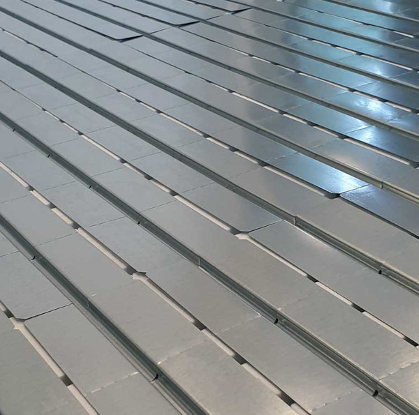 Die eine Möglichkeit besteht darin, dass Strukturplatten aus EPS Polystyrol Hartschaum und Wärmeleitbleche aus verzinktem Stahlblech verwendet werden. Aufgabe der Wärmeleitlamellen ist hierbei die Heizrohre durch integrierte Rohrkanäle in Position zu halten und für eine gleichmäßige Wärmeverteilung zu sorgen. Steckverbindungen – ähnlich wie bei Puzzleteilen - an den Profilplatten erleichtern das Verbinden der einzelnen Platten miteinander. Auf die Heizrohre wird zunächst eine Trennschutzfolie verlegt, worauf im Anschluss die Trockenestrichplatten schwimmend angebracht werden können.